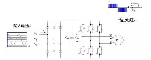 變頻器的基本構(gòu)造如圖2所示,包括整流電路與逆變電路兩部分。整流電路為普通二極管與濾波電容構(gòu)成的直流電壓輸出電路,逆變電路將直流電壓變換成脈寬調(diào)制的電壓波形(PWM電壓)。因此,變頻器驅(qū)動(dòng)電機(jī)的電壓波形是脈寬變化的脈沖波形,而不是正弦波電壓波形。用脈沖電壓驅(qū)動(dòng)電機(jī)就是導(dǎo)致電機(jī)容易損壞的根本原因。