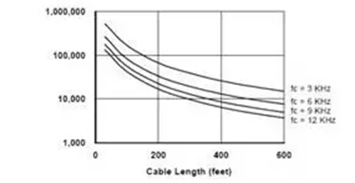 變頻器的載波頻率越高,輸出電流波形越接近正弦波,這會(huì)降低電機(jī)的運(yùn)行溫度,從而延長絕緣的壽命。但是,更高的載波頻率意味著每秒鐘產(chǎn)生的尖峰電壓數(shù)量更多,對(duì)電機(jī)的沖擊的次數(shù)更多。圖4給出了絕緣壽命隨著電纜長度與載波頻率的變化。從圖中可知,對(duì)于200英尺長的電纜,當(dāng)載波頻率從3kHz提高到12kHz(變化4倍)時(shí),絕緣的壽命從大約8萬小時(shí)降低到2萬小時(shí)(相差4倍)。